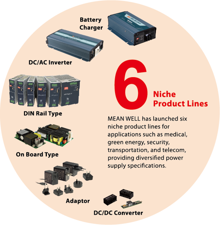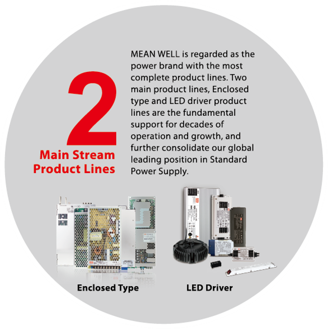 技術に根ざした企業精神を誇るMEAN WELL社は、毎年、製品ラインに10%の新しいデバイスを追加しています。各産業のアプリケーション要件を満たす、異なるレベルの0.5W~25,600Wの範囲内で完全な電源ソリューション(AC/ DC電源、LEDドライバ、AC/ DCバッテリー充電器、DC/ DCコンバータやDC/ ACインバータ)を提供しています。