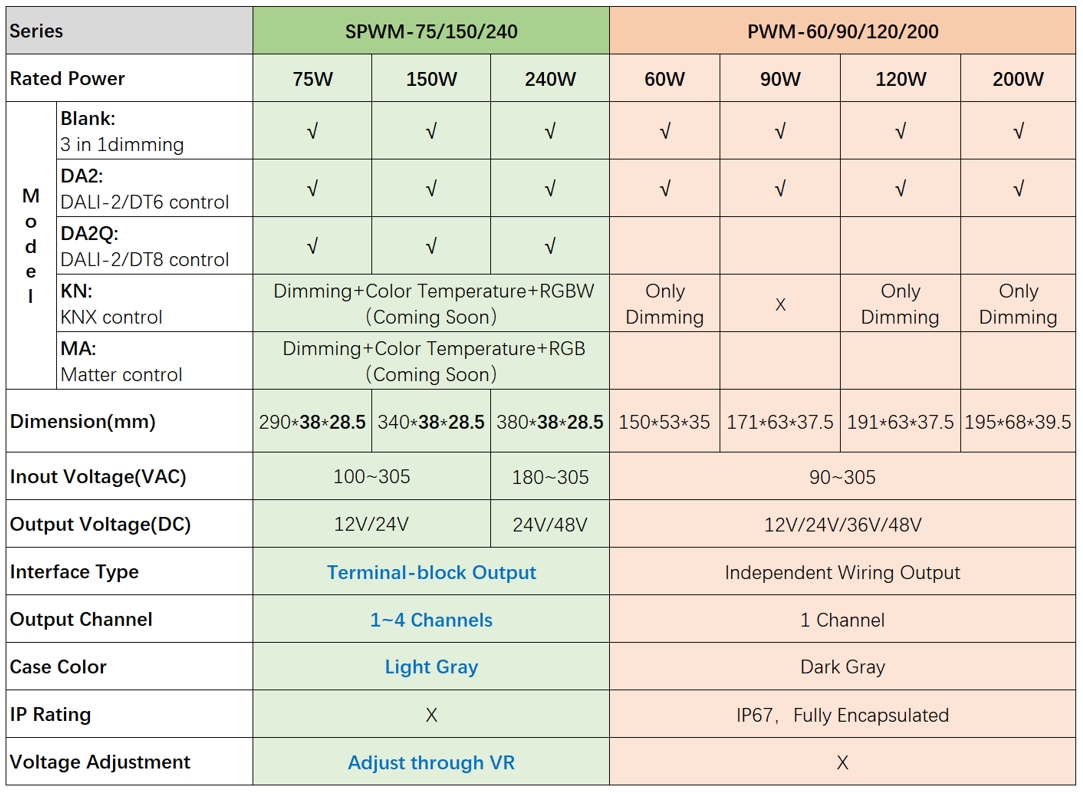 The SPWM-75/150/240 series features a light gray elongated plastic housing and terminal-style interfaces. The products allow flexible configuration of dimming, color temperature adjustment, and color tuning, achieving multi-functionality in a single unit. We are launching the 3-in-1 dimming and DALI-2 dimming/color tuning options now; the KNX/Matter dimming/color tuning models are coming soon.